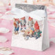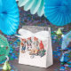 Tent-style with white ribbon favour box with a vintage image, on the front and back, of four elves out on a snowy day. One elf has tipped over his sled which another finds amusing. The other two elves look on with concern. See the entire Holiday Favour Box collection in the PARTY FAVORS section.