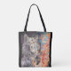 Watercolor art wolf tote! This Lovely wolf stands by a flame with the bonfire reflected in his eyes, primal and glorious! Makes a great gift or personal way to do your shopping and carry your things.