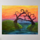 Fine art poster print of an original acrylic painting showing two stylised trees embracing each other over a body of water in front of a rainbow-coloured sky. This print is also available on premium stretched canvas in my store.
