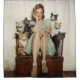 A delightful and humourous take on the “crazy cat lady” trope, this vintage-style portrait features a cheerful young woman sitting on a vintage trunk, surrounded by an adorable assortment of cats. Dressed in a retro floral dress and sturdy boots, her playful smile and the quirky cat companions bring charm and humour to the scene, celebrating the joy of feline obsession.