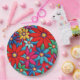 Embroidery abstract daisy flower pattern in red, yellow, blue, and green colours.