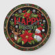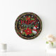 This richly detailed clock gives the illusion of being an intricate embroidery or needlework piece on a black background. It features the bold text "HAPPY HOLIDAYS" surrounded by a festive arrangement of pines, red berries, a reindeer, a snowman in a Santa hat, and large red poinsettia flowers. The entire design is framed by a highly detailed, golden-threaded garland. The design may look real due to the high detail and three-dimensional texture in the artwork.