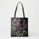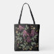Spring's purple irises bloom on a black canvas, embroidery delight.