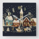 Embroidery Christmas Snowy Village Scene Blue Square Wall Clock