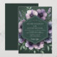 This elegant wedding stationery features a dramatic and moody aesthetic. Beautifully rendered watercolor anemones in shades of lavender, amethyst, and soft purple bloom against a deep emerald green background. Lush green foliage and sprigs of lavender complete this romantic and sophisticated botanical arrangement.