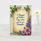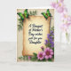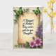 This card centres on an antique-toned parchment panel with softly curled edges, set on a lightly textured cream background. Across the middle of the parchment, black flowing lettering reads “A Bouquet of Mother’s Day wishes just for you Daughter,” with the words evenly spaced and easy to spot. Two green butterflies rest near the upper corners, their wings shifting from deep emerald to bright lime as if pausing together in a quiet, affectionate moment ❤️. Along the right edge, a slim vertical trail of tiny violet flowers climbs upward through leafy green stems, like a gentle guide for the eye. In the lower right area, a fuller cluster of fuchsia-pink, daisy-like blooms opens wide, their warm brown centres adding a cosy, friendly touch 🌼. The mix of greens, purples, and pinks against the mellow beige creates a calm garden scene that feels close and caring. The parchment and floral elements are shaded to look slightly raised, with the butterflies positioned near the top corners and the largest pink flowers anchoring the bottom right.