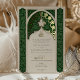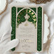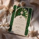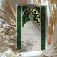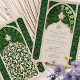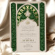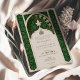 Embrace the beauty of tradition and the essence of nature with this Verdant Elegance Islamic Lace Wedding Invitation. This design beautifully marries the intricate lace patterns synonymous with Islamic art and the natural foliage themes of Art Nouveau. The front of the invitation boasts a deep forest green backdrop overlaid with an elaborate ivory lace design, featuring subtle hints of sage and olive green within its foliage patterns. It’s framed by a graceful arch, creating a window-like effect. The back side presents a harmonious blend of the same rich colours, centred with a stylishly framed text section that includes the wedding details. Accented with gold foil elements that add a touch of opulence, this invitation is a testament to sophisticated artistry and cultural heritage.