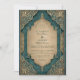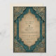 An opulent Islamic wedding design featuring a teal and gold arched frame inspired by mosque architecture and Persian artistry. With intricate floral motifs and geometric symmetry, this invitation exudes elegance, spirituality, and timeless cultural refinement — ideal for a luxurious Islamic wedding.