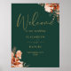 This elegant rustic floral wedding welcome sign can be personalised with your information in chic gold typography on an emerald green background. Designed by Thisisnotme©