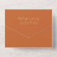 The left-hand edge of this elegant modern all-in-one wedding invitation and RSVP features an emerald green watercolor agate border trimmed with faux gold glitter. The customizable text combines gold-colored whimsical handwriting, copperplate and italic fonts on a burnt orange background. The return address appears on the outside flap and the reverse side of the detachable RSVP card in gold-colored text on solid burnt orange. A QR code is included on the RSVP card for guests who would prefer to reply online.