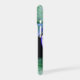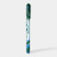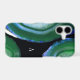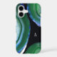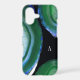 Elegant and eyecatching phone case features a vibrant image of agate geode slices in bright shades of emerald green with blue accents on a black background. Personalise with your initials or monogram tucked into the design in classic white lettering.