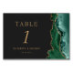 The right-hand edge of this elegant modern wedding table number card features an emerald green watercolor agate border trimmed with faux gold glitter. The customisable text combines gold-coloured serif, italic and copperplate fonts on an off-black background.