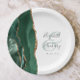 These elegant modern wedding plates feature an emerald green watercolor design trimmed with faux gold glitter. Easily customise the green text on a white background, with the names of the bride and groom in handwriting calligraphy over a large ampersand.