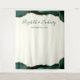 This elegant wedding photo booth tapestry features an emerald green and gold agate border at the top and bottom on an ivory background. Personalise it with the names of the bride and groom in green handwriting font followed by the date.