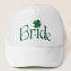 This forest green and white "Bride" ball cap has a lucky 4 leaf clover on the front, with the green shamrock as the dot of the "i".