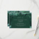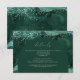 This design features a dark green arch on a background of emerald green watercolor agate trimmed with green and silver faux glitter. The word "details" appears in elegant white calligraphy script, with customisable white text below. The green and silver design is repeated on the back of the card.