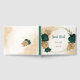 Beautiful fall wedding guest book featuring emerald green and beige gold flowers with green leaves .
