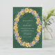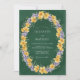 A deep emerald green backdrop sets a sophisticated stage for vibrant yellow primroses and delicate lavender blossoms. The design showcases a lush border of botanical elements, including verdant leaves and tiny purple petals. This organic color palette of forest green, gold, and violet creates a fresh and elegant atmosphere for a seasonal nature-themed event.