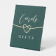 Direct your guests with style using this elegant emerald green cards and gifts sign. Featuring a romantic gold rope heart and classic typography, it’s the perfect addition to your wedding gift table or reception décor.