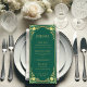 An elegant menu with a vintage air, recommended for a wedding with emerald green and gold wedding colours.
