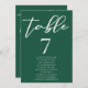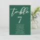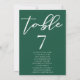 This solid emerald green wedding table number with names features classic white script for a couple getting married in a forest or other nature venue. Celebrate your love with this tranquil colour and coordinate with our matching minimalist typography seating chart.