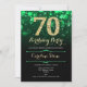 70th birthday party invitation. Elegant emerald green and black design with faux glitter gold. Features stylish diamonds, bokeh lights and script font. Men or women bday invite. Perfect for a stylish adult birthday party. Personalise with your own details. Message me if you need further customisation. Printed Zazzle invitations or instant download digital printable template.