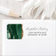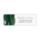 The left-hand edge of this elegant modern wedding invitation return address label features an emerald green watercolor agate border trimmed with faux gold glitter. The customizable text combines charcoal gray handwriting script and copperplate fonts on a white background.