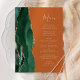 The left-hand edge of this elegant modern wedding menu features an emerald green watercolor agate border trimmed with faux gold glitter. The customisable text combines gold-coloured whimsical handwriting script and copperplate fonts on a burnt orange background. The reverse side features a matching emerald green and gold agate design.