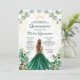 The quinceañera invitation features a luxurious, nature-inspired design with a green and gold colour palette. The front shows a watercolor illustration of a young woman in an emerald ballgown framed by eucalyptus leaves, flowers, and gold accents, creating an elegant and dreamy look. The back continues the theme with a glamourous photo of a young woman in a sparkling gown against a rich green backdrop, surrounded by the same floral and botanical elements for a cohesive, sophisticated feel.
