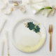 Beautiful wedding paper plate featuring emerald green flowers and gold leaves.