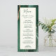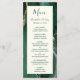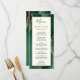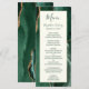 This elegant modern wedding menu features an emerald green watercolor agate frame. The customisable text combines green whimsical handwriting script with italic and copperplate fonts on an ivory background. The reverse side features a matching emerald green and gold agate design.
