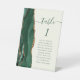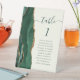 The left-hand edge of this elegant modern wedding table number pedestal features an emerald green watercolor agate border trimmed with faux gold glitter. The word "table" appears in whimsical green handwriting script on an ivory background. Add the names of your guests who are assigned to each table.