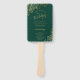 These beautiful hand held fans are designed to serve as both cooling for your guests, and a wedding program. The elegant design features gold script calligraphy on an emerald green background with ornate golden faux foil lace frills in the corners. There is space to list the ceremony order as well as the wedding party and a short thank you note. Wonderful memento of your special day.