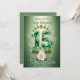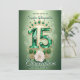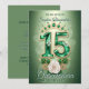 Unveil a Quinceañera fit for royalty with this customisable invitation. The front shines with a magnificent "15" crafted from sparkling emerald-green gemstones, crowned by an elegant matching tiara. Delicate white rose and golden flourishes add timeless beauty against the soft green background. The reverse provides all essential details on a coordinating emerald hue, ensuring a seamless and celebrated event.