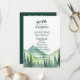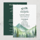 The deep forest green and emerald green colours used in the design give it a natural, rustic feel, perfect for a backwoods country wedding or a nature camping adventure. With towering mountain pine trees in the background, this design is sure to transport you and your guests to a serene forest setting.