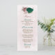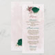 Beautiful romantic wedding menu card featuring emerald green and pink flowers and some leaves .