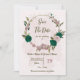 Beautiful romantic wedding save the date invitation featuring emerald green and pink flowers and some leaves .