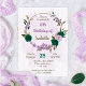 Beautiful romantic birthday party invitations featuring emerald green and purple flowers and some leaves .