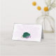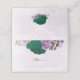 Beautiful romantic wedding place card featuring emerald green and purple flowers and some leaves .