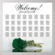 Make a stunning first impression on your wedding guests with this 32-table seating chart. The design is romantic and sophisticated, featuring a single long-stemmed deep emerald green coloured rose reflected in water. With space for 320 names arranged in the traditional 10-seat layout, this seating chart ensures every guest knows where to sit. The title is written in beautiful script calligraphy and reads: Welcome! Please find your table. The names of the couple and wedding date appear at the bottom, making this seating chart a beautiful keepsake. It's a perfect way to add timeless elegance and style to your reception while making it easy for your guests to find their seats.