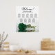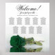 This exquisite wedding seating chart contains 9 tables and showcases a romantic design featuring a single long-stemmed deep emerald green coloured rose resting on its side and reflecting in a pool of water. The title, "Welcome - please find your table," is displayed above the names of the couple and the date of the wedding. With seating arrangements for 90 guests and 10 seats per table, this chart provides ample space for guests to locate their seats with ease. The sophisticated, stylish, and chic design adds an element of grace and class to your wedding reception.