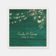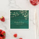 Rustic wedding napkins featuring a rich emerald green wood texture background accented with delicate gold floral line art and soft glowing lights. These elegant napkins are perfect for rustic, woodland, forest, and romantic outdoor weddings, adding warmth and depth to your reception décor.