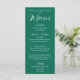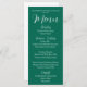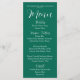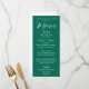 Simple style, emerald green colour dinner menu card for your wedding that features white, stylised script along with your personalised information. Reverse side of menu is white. Edit menu card and replace wedding names and date along with menu items that will be served at your wedding reception. Select your menu card style as desired.