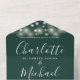 All in one wedding invitation featuring pretty string lights, elegant signature script name and monogram initials on an emerald green background. The invitation includes a perforated RSVP card that can be individually addressed or left blank for you to handwrite your guest's address details. Designed by Thisisnotme©