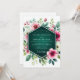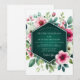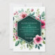 This design features an emerald green background surrounded by a lush wreath of romantic pink and white blooms. Delicate blush roses and anemones are nestled among soft sage eucalyptus and greenery. The sophisticated palette creates a moody yet elegant atmosphere for botanical themed events. This artistic watercolor style brings a touch of timeless charm.