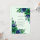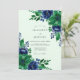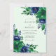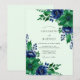 This design showcases a vibrant mix of navy blue anemones and emerald green peonies over a serene mint backdrop. Hand-painted watercolor leaves and botanical sprigs adorn the edges with a fresh, organic feel. The deep jewel tones provide a sophisticated contrast for a spring or summer event.
