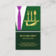 Cover features an emerald green tuxedo suit with an underlying darker green apron layer. At the top of the card is a gold serving plate with gold cutlery on top. At the darker green apron layer you have your prestigious name, the job title and contact details near the base of the card.