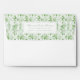 This envelope has a white exterior with an emerald green and white watercolor damask design on the inside and outside flap. The return address is on the outside flap in a blue all-caps serif font with a thin blue border surrounding the address. Behind the address is a coordinating damask design. This envelope coordinates with the other products in the Christmas Wreath with Candy Cane Bow Wedding Collection.
