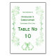 Green wedding table number bells design. You can customise this emerald coloured wedding table number with your own wedding details. Should you require any help with customising then contact us through the link on this page. Bells scrollwork design personalised green coloured wedding table number