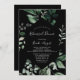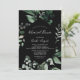 This emerald greenery black rehearsal dinner invitation is perfect for a boho wedding rehearsal. The elegant yet rustic design features moody dark green watercolor leaves and eucalyptus with a modern bohemian woodland feel.